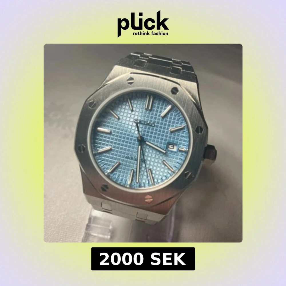 41mm automatisk klocka med åttakantig boett i borstat stål och länkarmband. Urtavlan är ljusblå med ett diskret rutmönster och silverfärgade index. Klockan har datumvisning och transparent baksida som visar urverket.