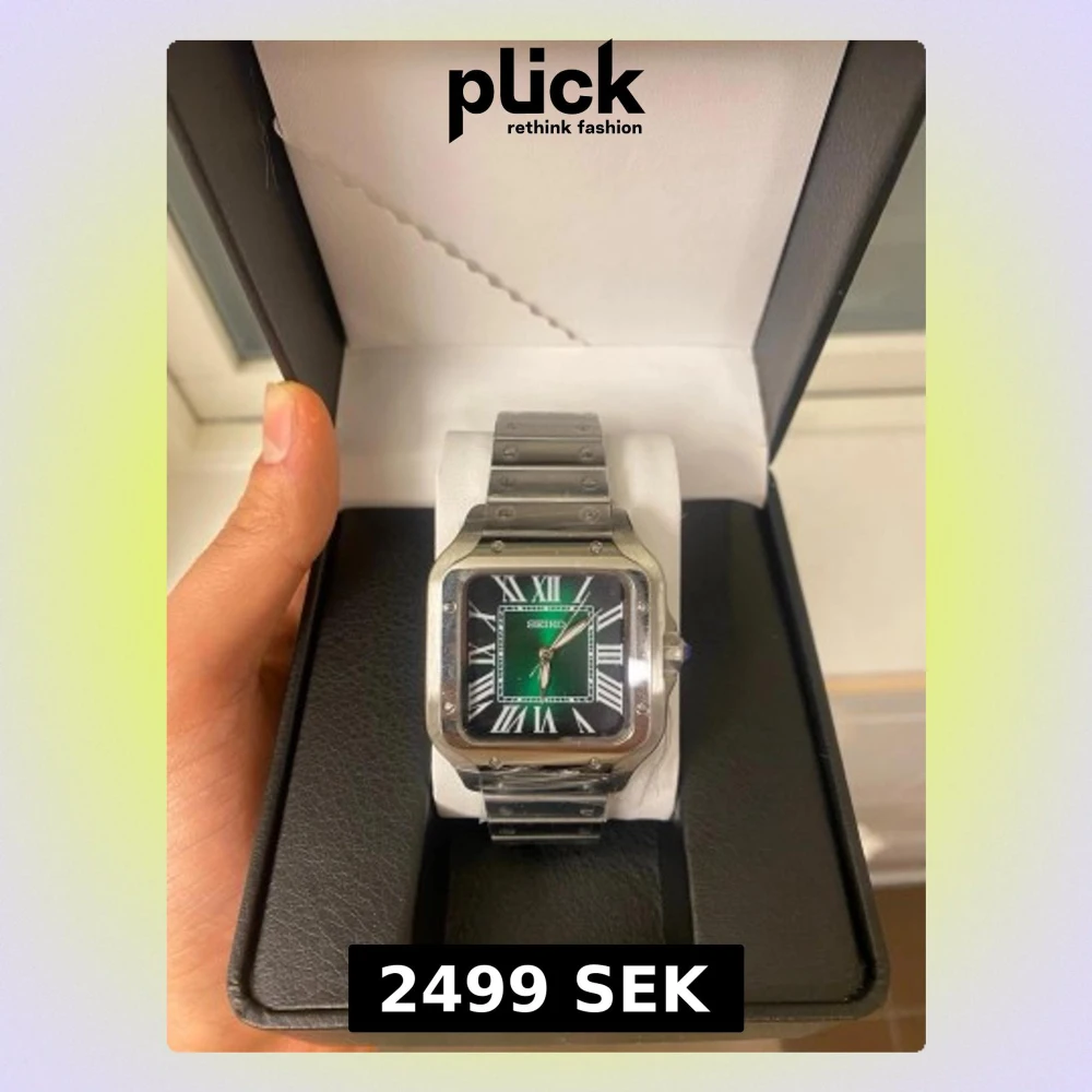 Stilren Seiko klocka med fyrkantigt silverfärgat boett och länkarmband i metall. Urtavlan är grön med vita romerska siffror och svarta detaljer. Klockan har en klassisk och elegant design som sticker ut med sin färgade urtavla. Passar perfekt som present till alla hjärtansdag. Hör gärna av dig vid funderingar