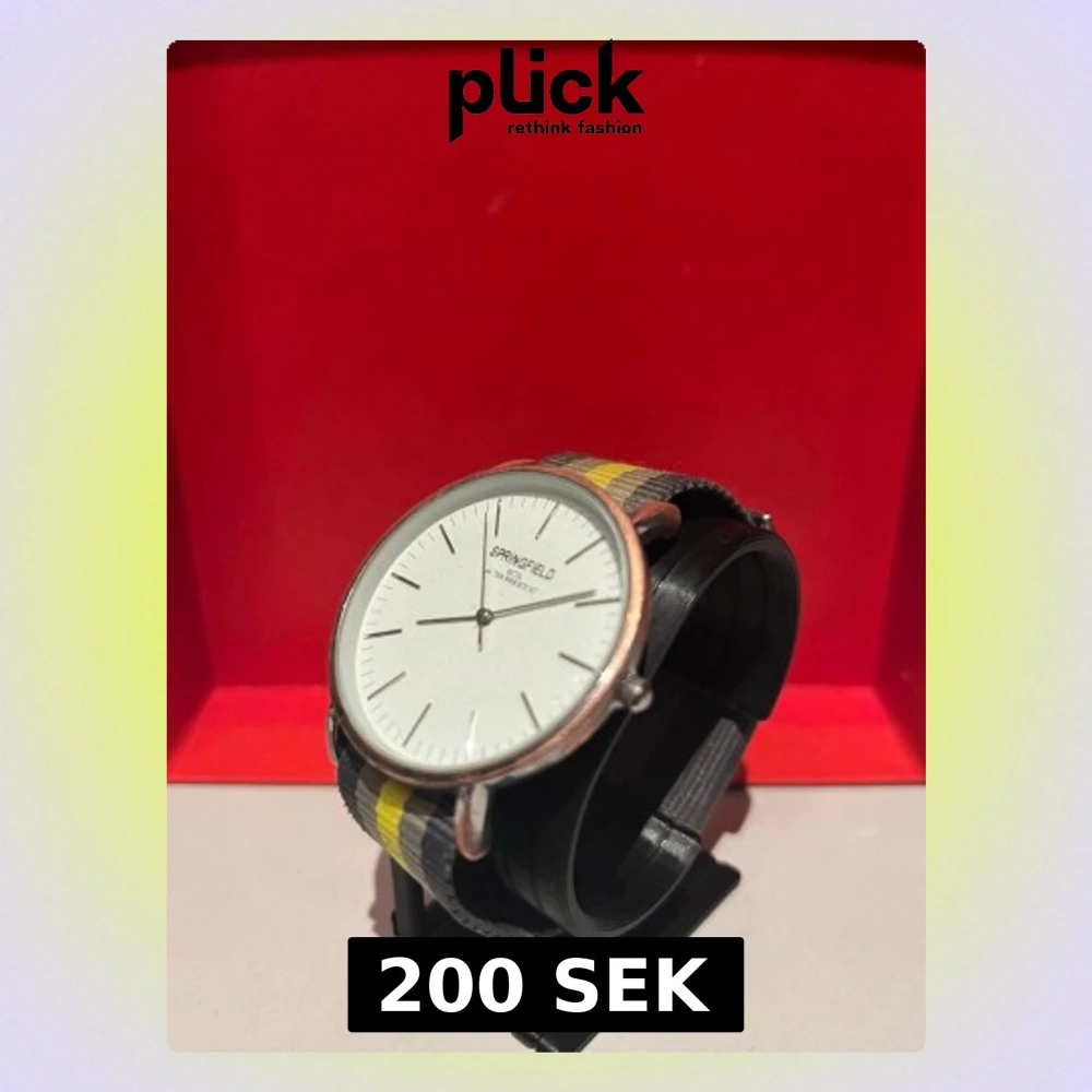 En enkel klocka från Springfield nypris på ca 1400 den är simpel och armbandet är mycket enkelt att anpassa på armen om ni vill ha röd vit blå armband så säg till så byter jag armbandet