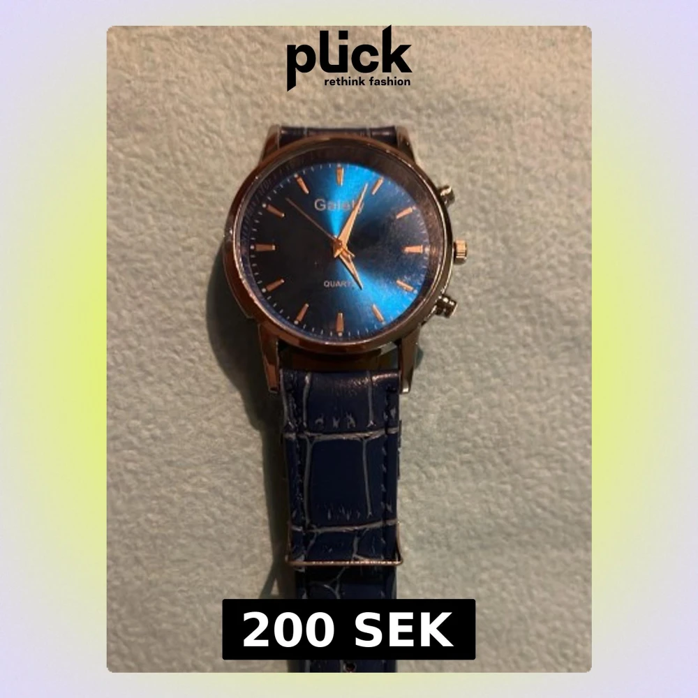 Stilren klocka från Galex med blå urtavla och guldfärgade detaljer. Armbandet är i blått konstläder med krokodilpräglat mönster. Klockan har tre knappar på sidan och klassisk analog visning. Perfekt accessoar för att lyfta din outfit.
