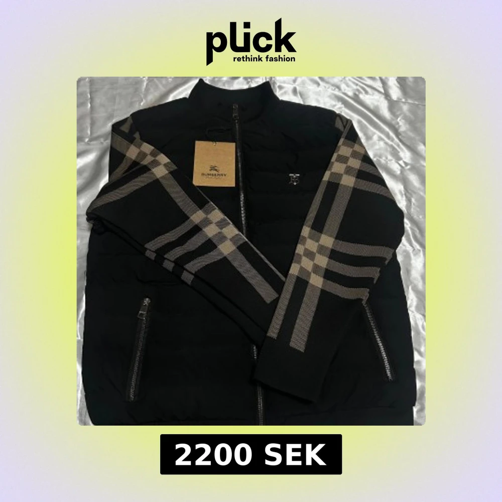 Svart pufferjacka från Burberry med klassiska rutiga ärmar i beige och grått. Jackan har dragkedja framtill, två fickor med dragkedja och diskret Burberry-logga på bröstet. Perfekt för dig som vill ha en stilren och lyxig look.
