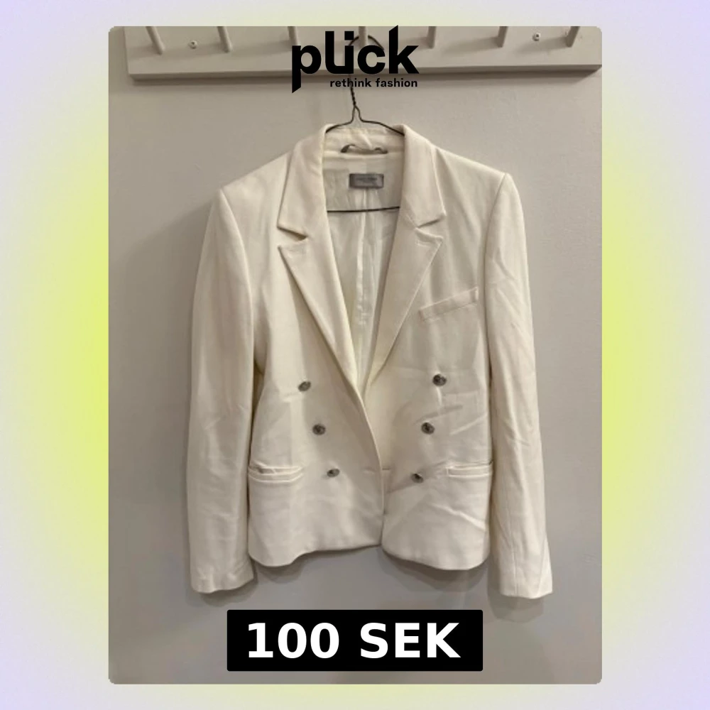 Snygg vit kavaj från Hunkydory med dubbelknäppning och silvriga knappar framtill. Klassisk krage, långärmad och med fickdetaljer. Perfekt för dig som vill ha en stilren och fräsch look.