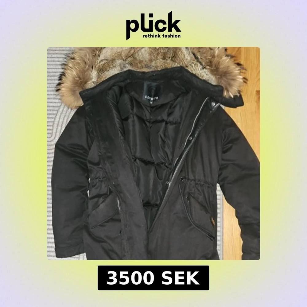 Säljer en svart dunparkas från Cedrico med fluffig päls runt huvan och quiltad insida. Jackan har dragkedja, praktiska fickor och snygga detaljer i lammnappa. Yttermaterialet är bomull och polyester, fodret är dun och pälsen är tvättbjörn/kanin. Perfekt för kalla dagar.