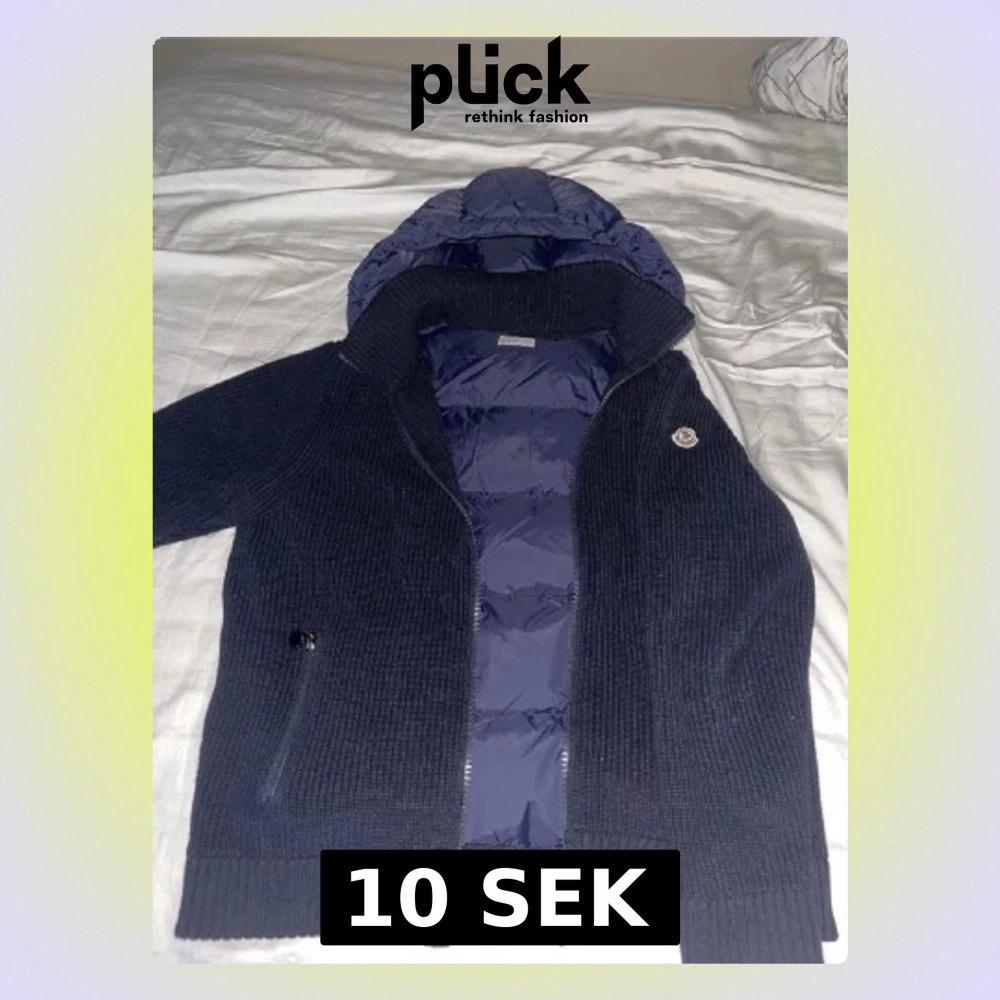 Säljer en mörkblå pufferjacka från Moncler med stickade ärmar och quiltad kropp. Jackan har en stor huva, dragkedja framtill och två fickor med dragkedja. Perfekt för kyliga dagar och riktigt snygg till jeans eller sweatpants.