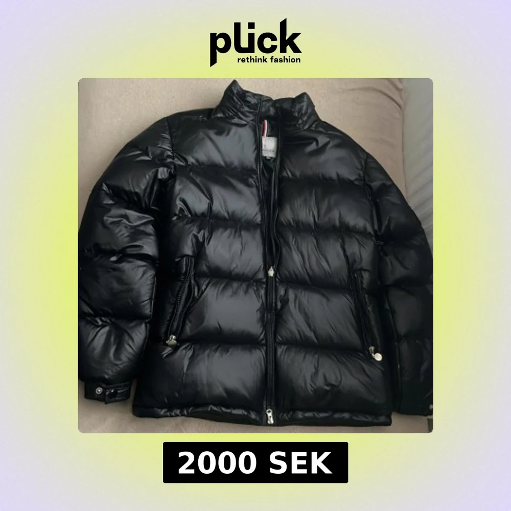 Säljer en svart pufferjacka från Moncler med glansig finish och klassisk Moncler-logga på ärmen. Jackan har hög krage, två dragkedjefickor och hel dragkedja framtill. Perfekt för kalla dagar och riktigt snygg till streetwear-stilen.