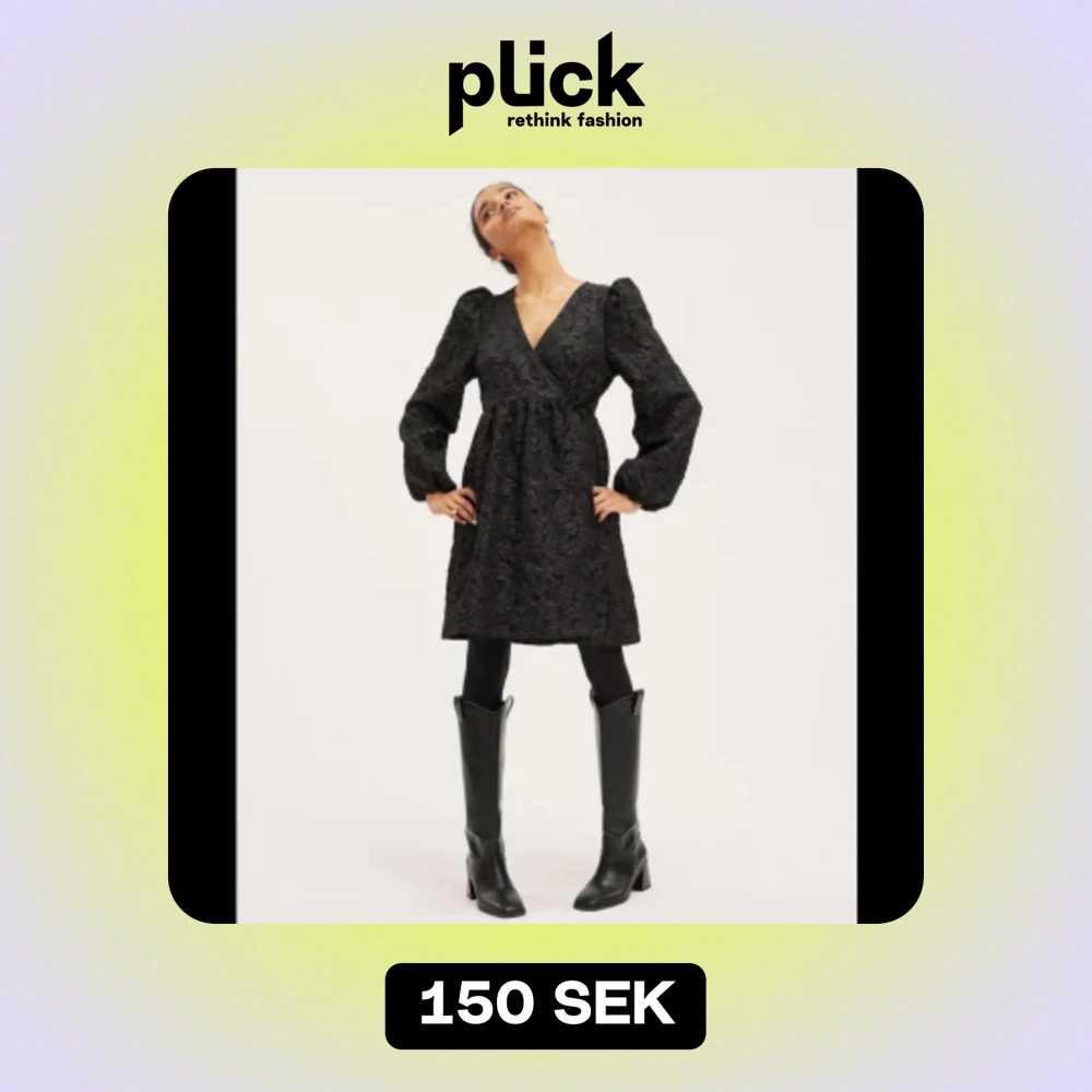 Säljer en superfin svart klänning med puffärmar och v-ringning. Den har ett vackert broderat mönster som ger en lyxig känsla. Perfekt för festliga tillfällen! Klänningen har en omlott-design och är i en bekväm längd som slutar ovanför knäna.
