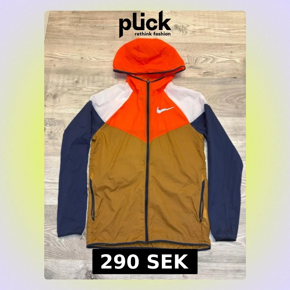 Nike vindjacka med huva i en fet färgkombo: orange, brunt, vitt och mörkblått. Jackan har hel dragkedja, två sidofickor med zip och den klassiska Nike-loggan på bröstet. Lätt och tunn polyester, perfekt för blåsiga dagar. Snygg sportig look och skön passform.