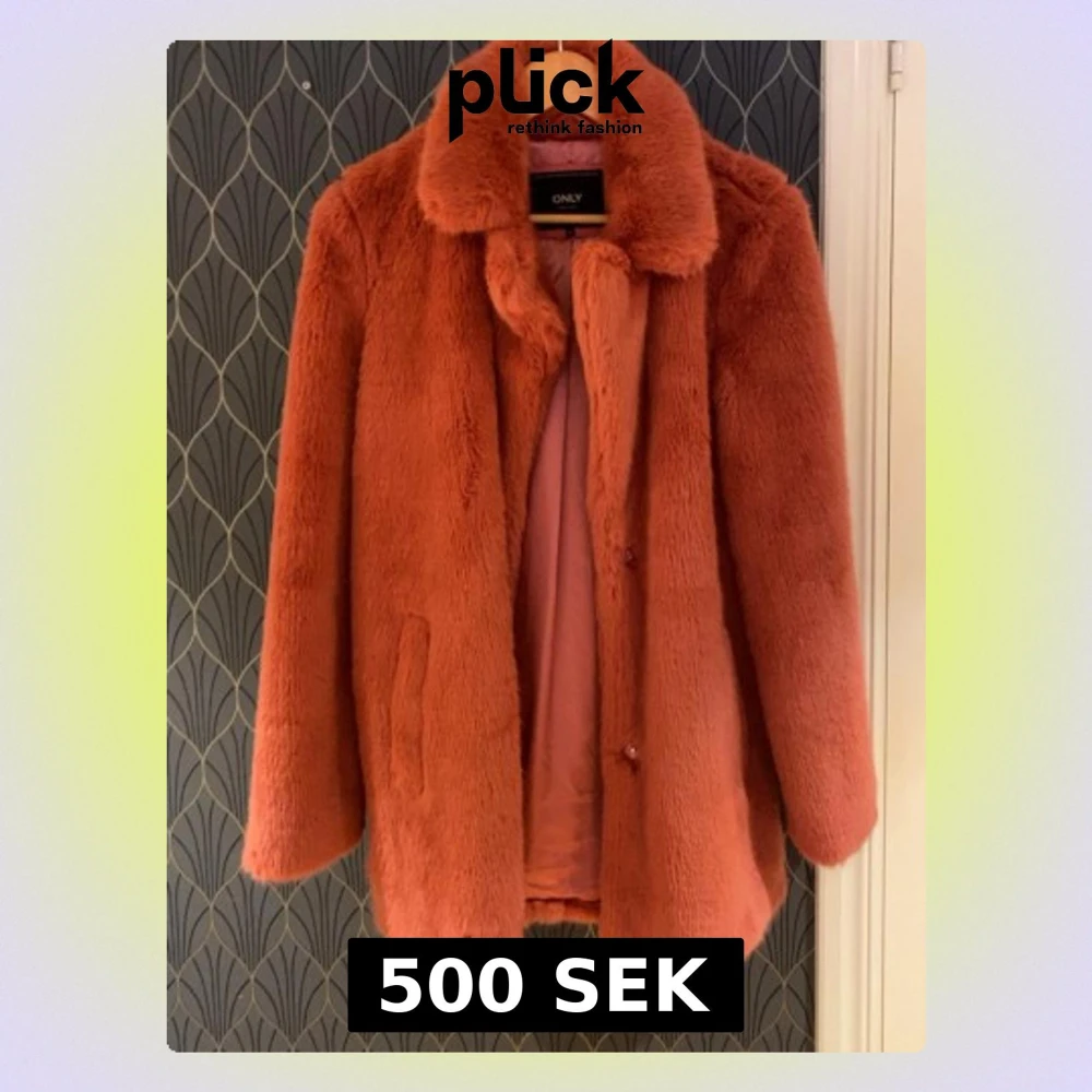 Säljer en fluffig och trendig rostfärgad pälsjacka från ONLY. Jackan har klassisk krage, dolda knappar framtill och två sidofickor. Perfekt för dig som vill ha en varm och snygg jacka med oversized känsla och mjuk finish.