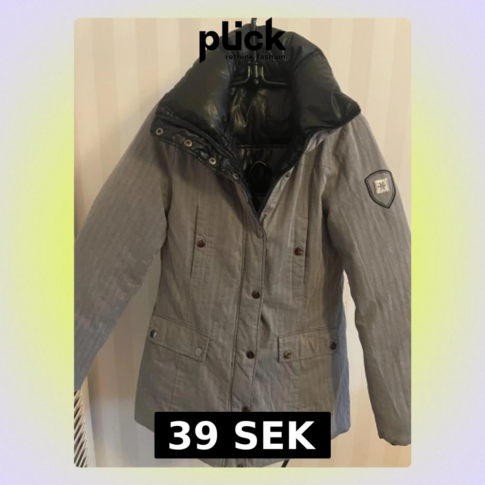 Säljer en vändbar pufferjacka i grått och svart. Ena sidan är grå med diskret randigt mönster och snöflinge-patch på ärmen, den andra sidan är helsvart och glansig. Jackan har tryckknappar, dragkedja och stora fickor. Perfekt för dig som vill ha två stilar i en jacka. Kan endast knäppas med knappar, dragkedja funkar dock saknas hak som man drar i , kan kosta mellan 50-80 kr hos syaffärer eller tas från nån annan jacka.