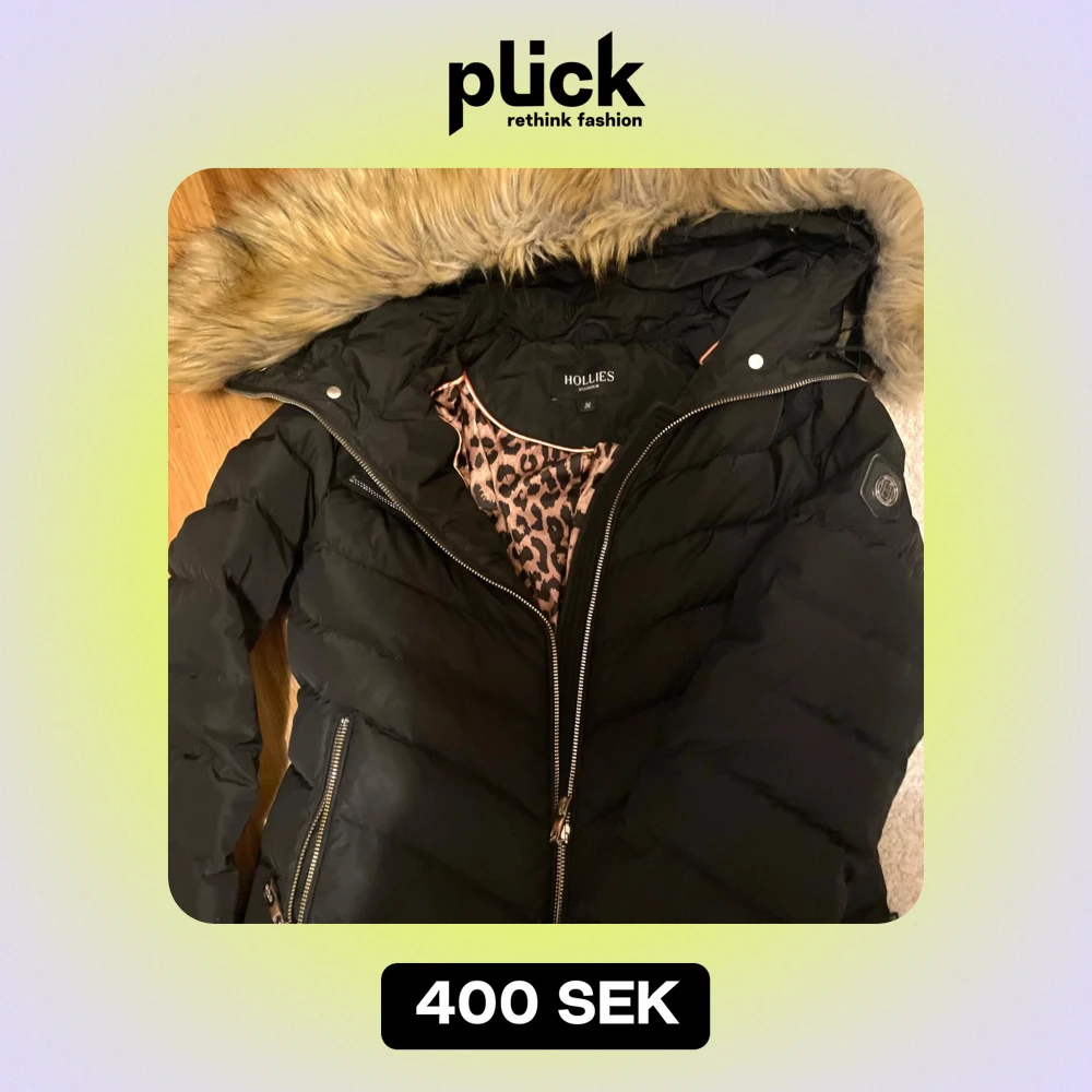 Säljer en snygg svart dunjacka från Hollies i storlek S/36 . Jackan har en mysig pälskantad huva och ett coolt leopardmönstrat foder. Perfekt för kalla vinterdagar med dragkedja och knappar för extra värme. 🖤