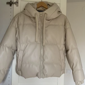 Vinterjacka - Säljer en lång beige pufferjacka med huva och snörning. Knappt använd. Jackan har dragkedja och knappar framtill, samt två fickor med guldfärgade dragkedjor. Perfekt för kalla dagar och har en snygg, enkel design som passar till det mesta.