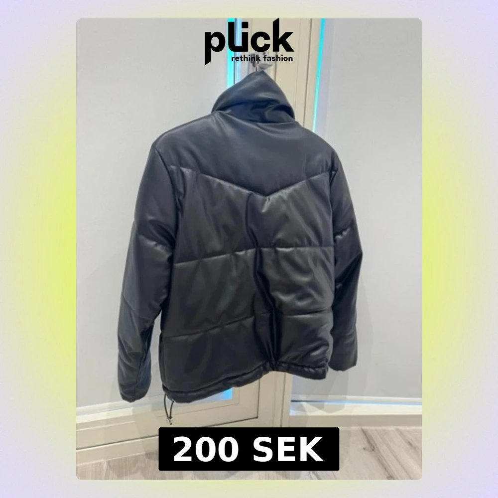 Snygg svart pufferjacka från H&M Divided i storlek XS. Jackan har quiltad design, hög krage och dragsko nedtill. Materialet är syntet med en läderliknande finish som ger en cool vibe. Perfekt för kalla dagar när du vill ha både stil och värme.