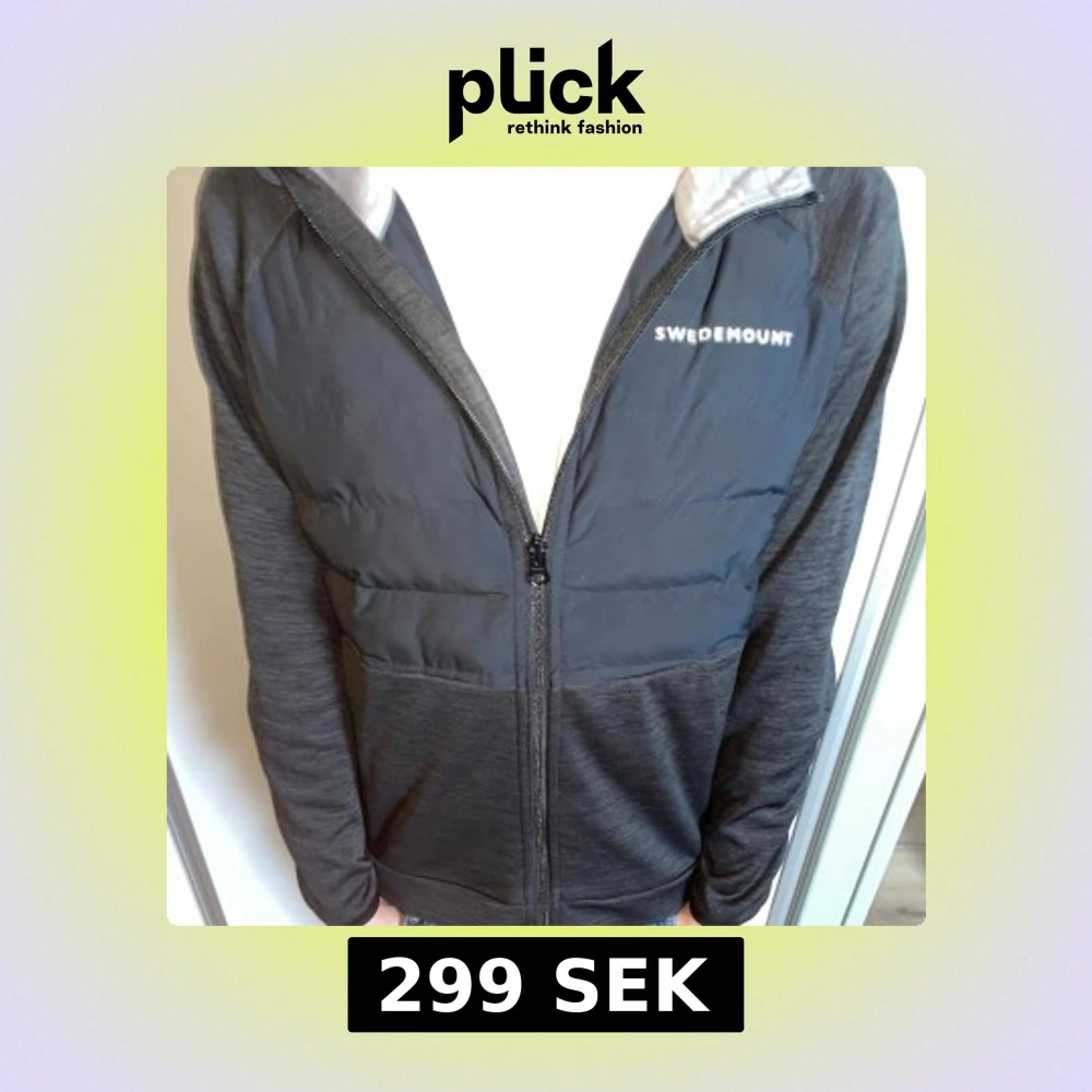 Snygg svart hybridjacka från Swedemount med vadderad framsida och mjuka ärmar och rygg i stretchigt material. Jackan har huva, hel dragkedja och en stilren look med logga på bröstet. Perfekt för lager-på-lager under kyliga dagar.