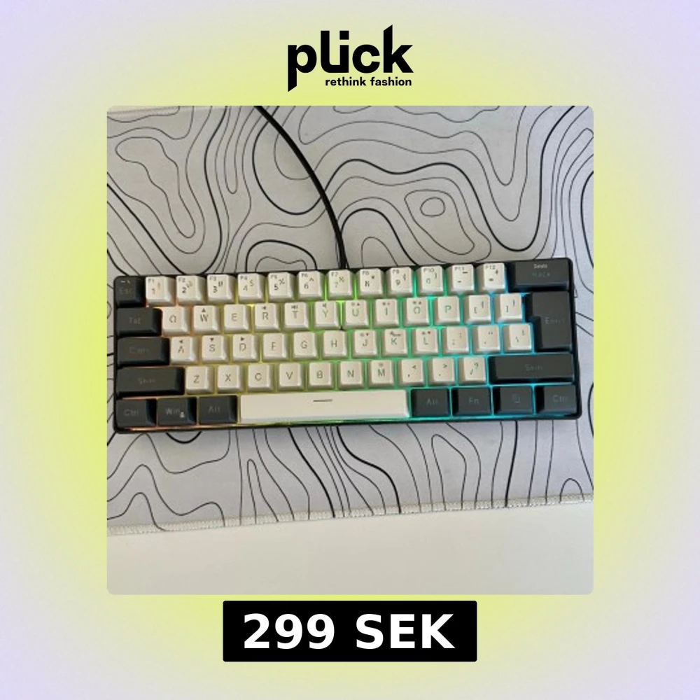 Säljer ett kompakt mekaniskt tangentbord med RGB-belysning och 60% layout. Tangentbordet har vita och gråa tangenter med tydliga symboler och är anslutet via kabel. Perfekt för gaming eller produktivitet, och har en modern design med plastmaterial.