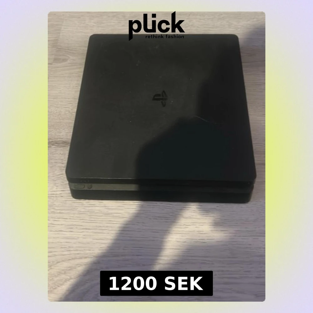 Säljer en svart PlayStation 4 Slim från Sony. Konsolen har en stilren, tunn och fyrkantig design med mattsvart finish och PlayStation-logga på ovansidan. Utrustad med HDMI, USB och nätverksport på baksidan. Perfekt för gaming och streaming.