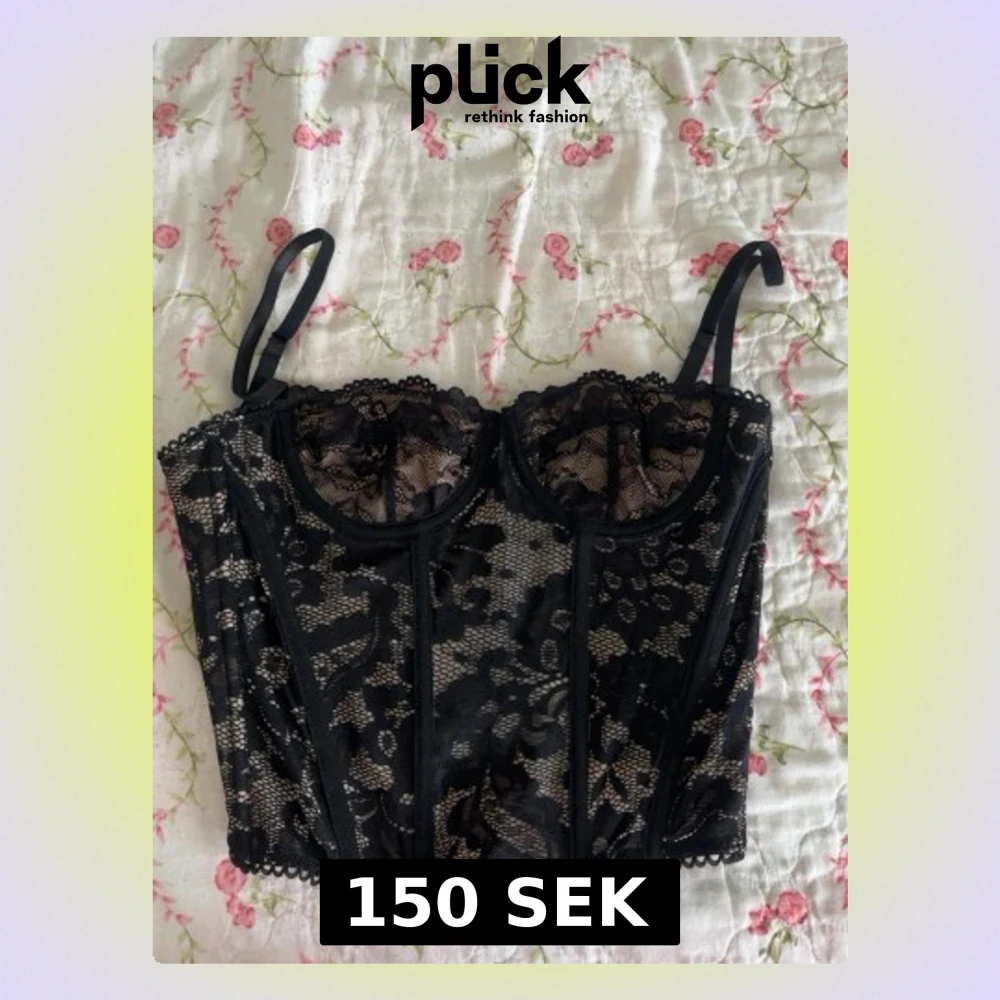 Snygg svart korsett med transparent spets och blommigt mönster. Har justerbara axelband.