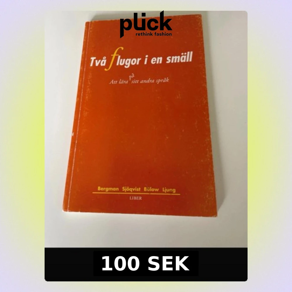 Kurslitteratur med orange mjukt omslag, titeln 'Två flugor i en smäll'. Boken handlar om att lära sig sitt andra språk och innehåller teori, praktik och exempel för undervisning i svenska som andraspråk. Författare: Bergman, Sjöqvist, Bülow, Ljung.