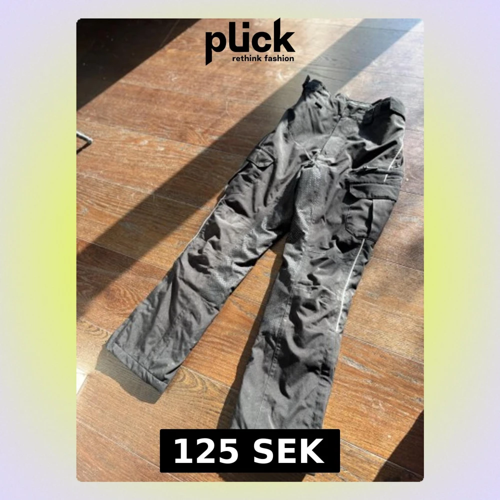 Säljer ett par svarta täckbyxor med flera praktiska fickor och justerbara kardborreband i midjan. Byxorna har raka ben och är tillverkade i ett slitstarkt material som passar perfekt för kalla dagar utomhus.