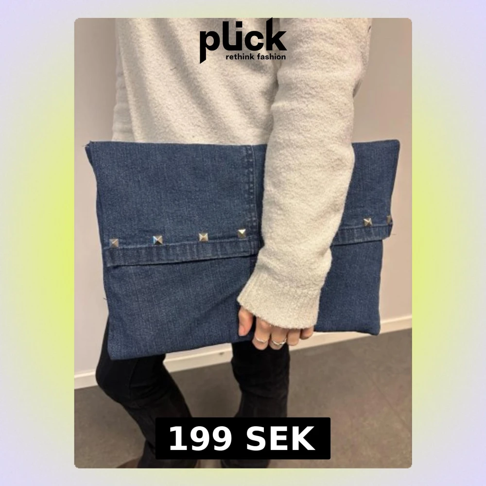 BlĂ„tt datorfodral av Ă„tervunna jeans med filt och silke inuti, silvriga nitar och magnetisk knapp!đ Fodralet Ă€r ca 37x27 cmđ