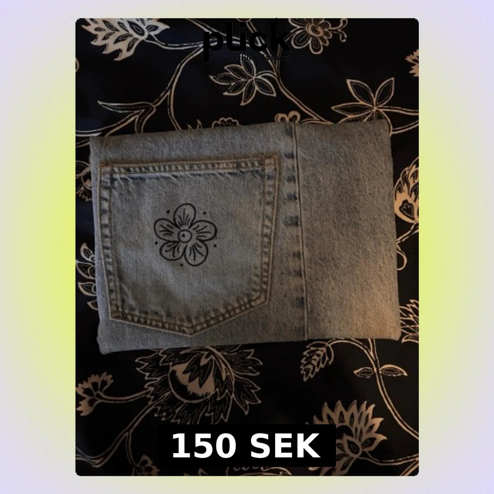 Säljer ett ljusblått jeansfodral med en cool handritad blomma på bakfickan. Jeansen har klassisk femficksdesign och är gjorda i denim. Perfekt för dig som vill ha något unikt och utstickande i vardagen. Materialet inuti är även vattentätt. Passar mindre datorer som 13 och 14 tum. De är även handgjorda så inte perfekta. Men ett perfekt val för en bättre miljö!🌏(Materialet är köpt second hand)