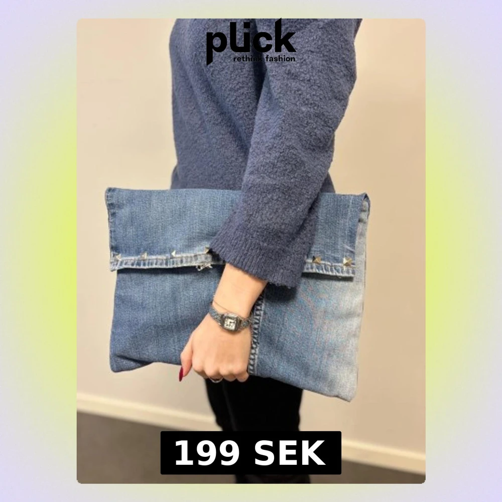 LjusblĂ„tt datorfodral av Ă„tervunna jeans med filt och silke inuti, silvriga nitar och magnetisk knapp!đ Fodralet Ă€r ca 37x27 cmđ