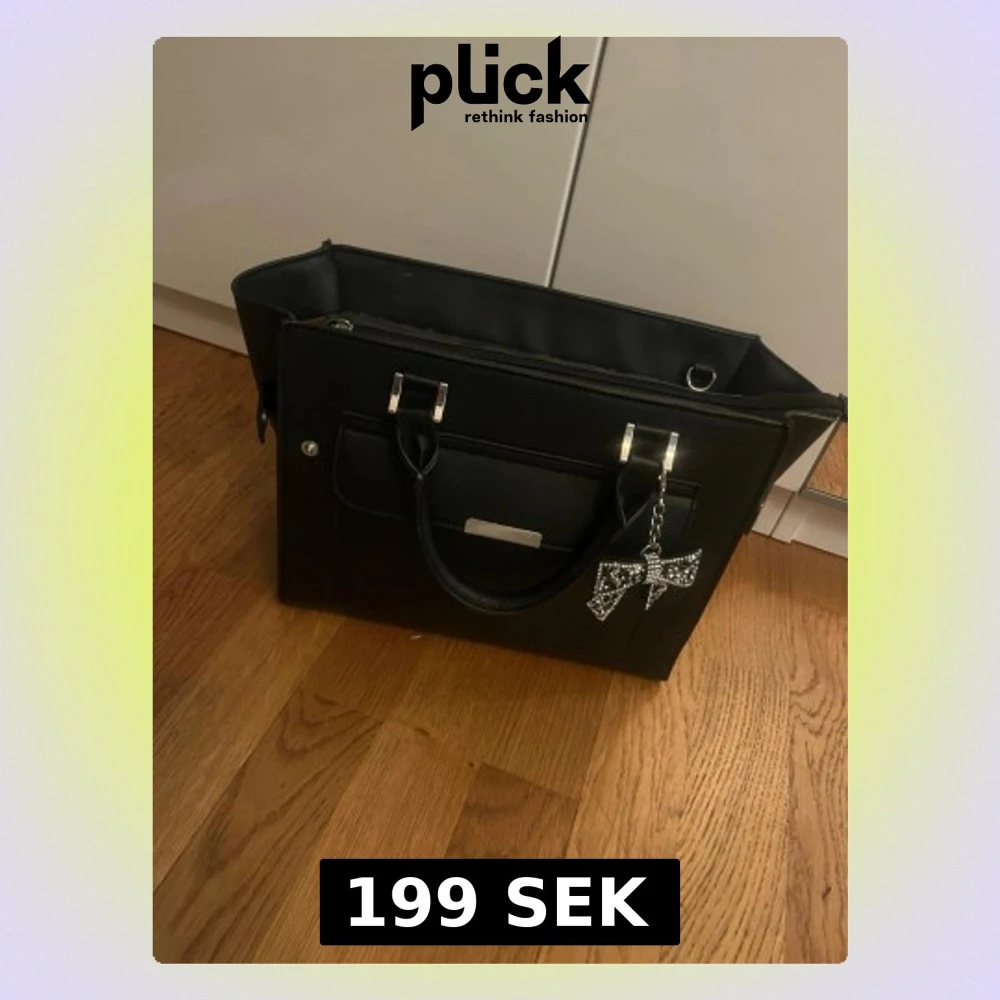 Snygg svart med både handtag och justerbar axelrem. Väskan har silverfärgade detaljer, en ficka framtill och en dekorativ nyckelring med strass. Insidan är fodrad i brunt tyg och har flera fack för organisering. Köpte för 700kr