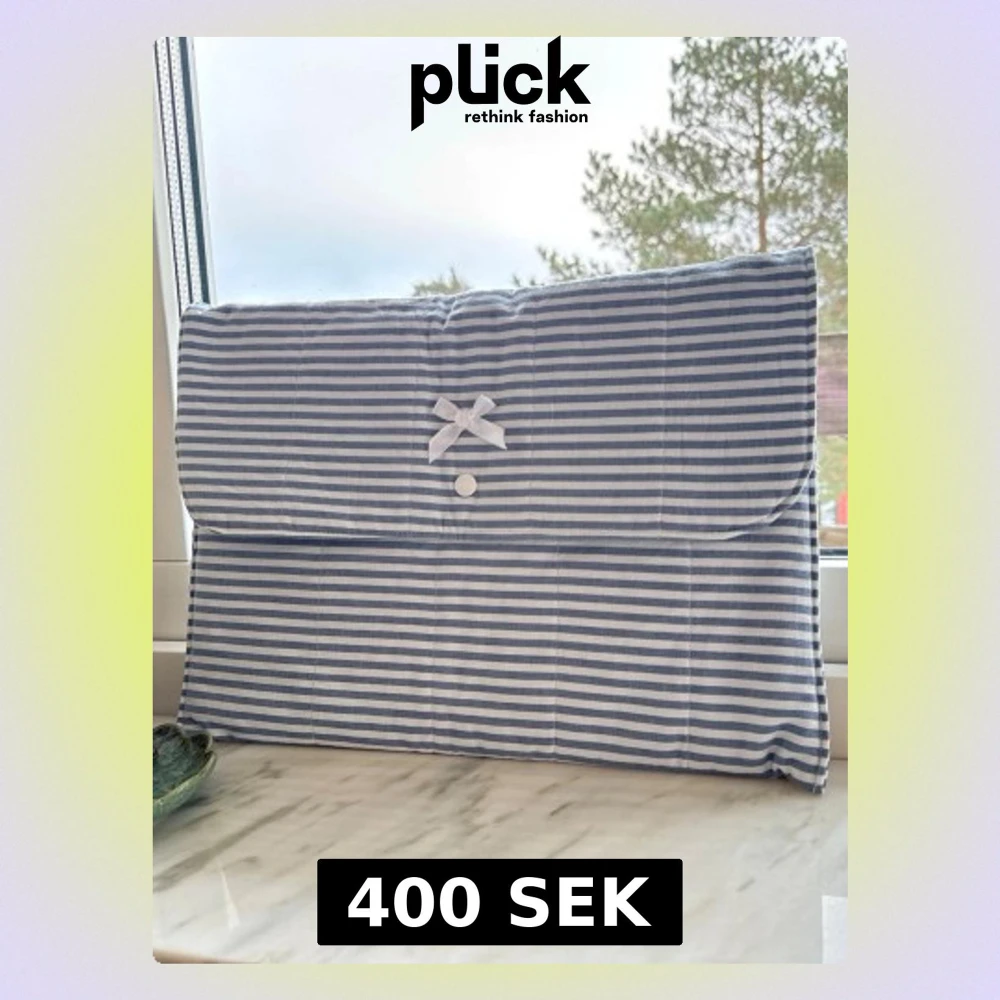 Snygg datorväska i blått och vitt med horisontella ränder. Väskan har en vadderad design, stängs med tryckknapp och är dekorerad med en liten vit rosett på framsidan. Perfekt för dig som vill ha en söt och stilren look till din laptop för jobb, skola eller vardag!💗🎀