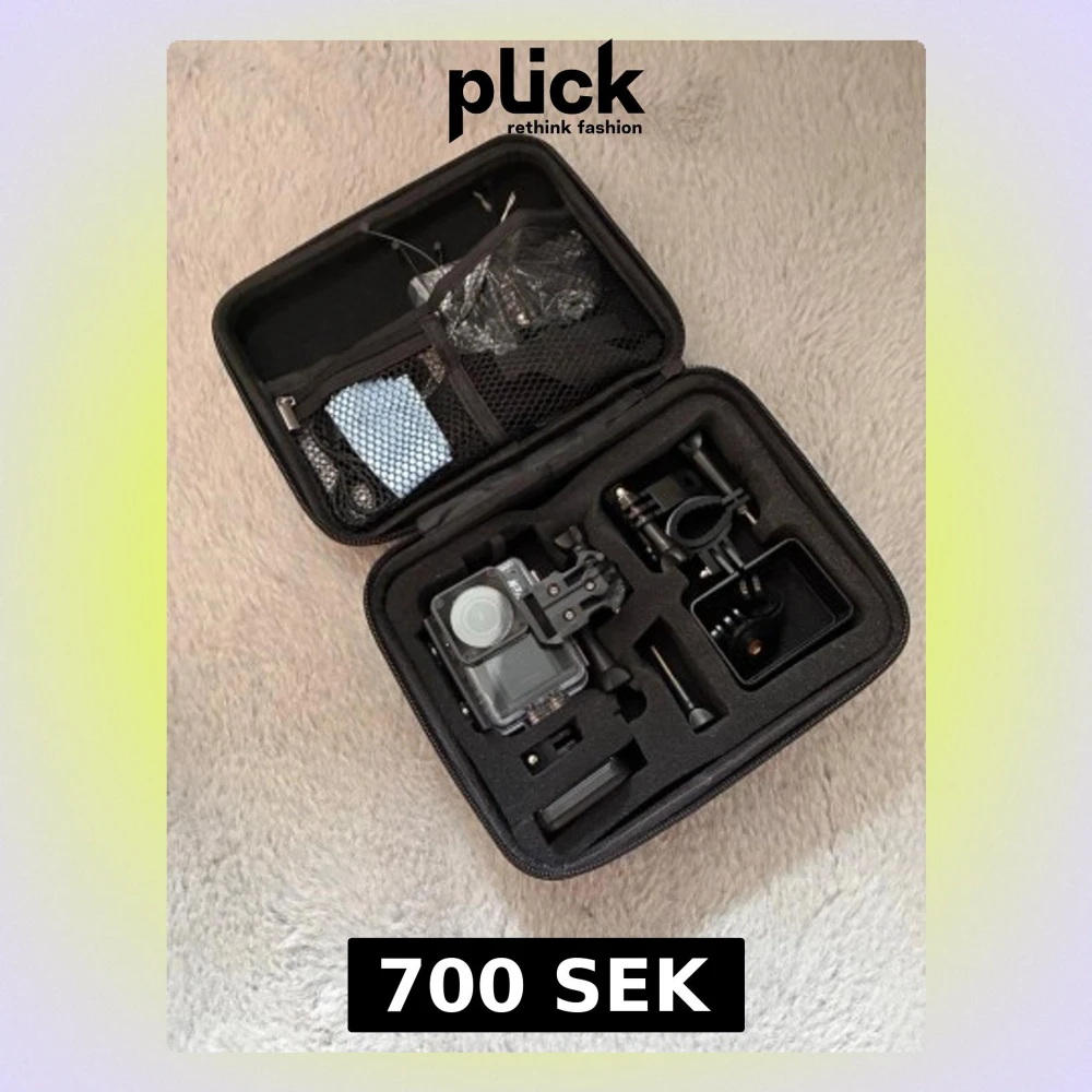 Säljer en svart Raven actionkamera i robust plastmaterial, levereras i en hård skyddsväska med flera fack och tillbehör som fästen och laddare. Perfekt för dig som vill filma äventyr och sport. Allt är snyggt organiserat i väskan.
