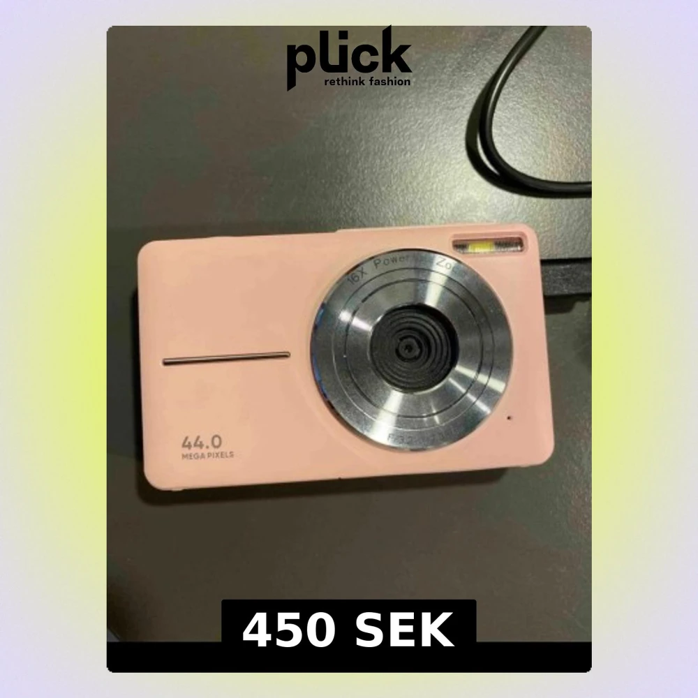 Snygg rosa digitalkamera med 44 megapixlar och 16x optisk zoom. Kameran har en kompakt rektangulär form, inbyggd blixt och en stor rund lins i metall. Perfekt för dig som vill ta skarpa bilder med stil. USB-port för laddning och överföring.