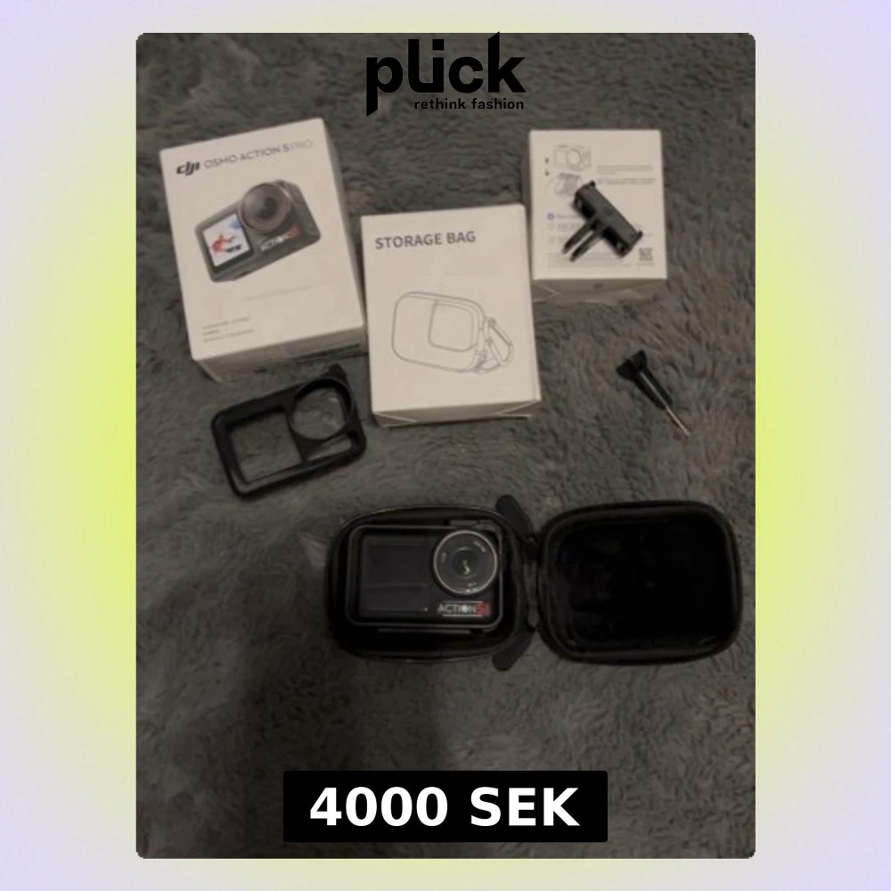 Säljer en DJI Osmo Action 3 Pro actionkamera i svart med tillhörande förvaringsväska, fäste och skydd. Kameran har en kompakt och robust design med stor lins framtill och display på baksidan. Perfekt för äventyr och vloggning. Allt som syns på bilden ingår.