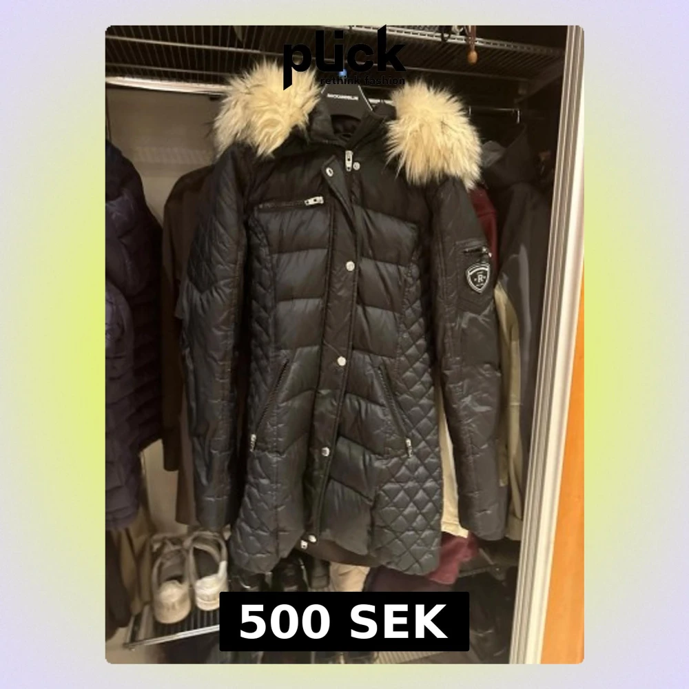 Svart lång dunjacka från Rockandblue med snygg quiltad design och avtagbar huva med ljus päls. Jackan har flera dragkedjefickor, tryckknappar och Rockandblue-logga på ärmen. Perfekt för kalla vinterdagar. Använd en vinter