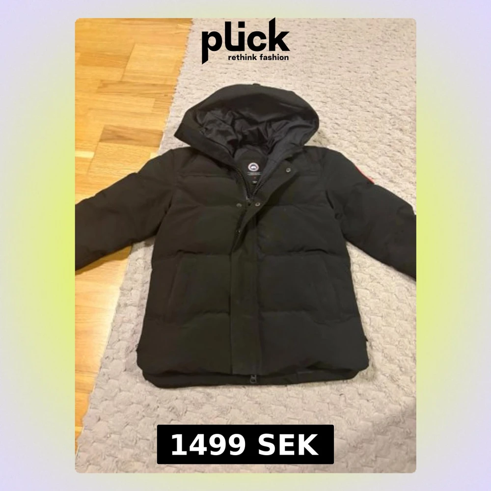 Säljer en svart dunjacka från Canada Goose med huva och klassisk logotyp på ärmen. Jackan har två stora framfickor och dragkedja med tryckknappar. Perfekt för kalla vinterdagar och riktigt varm tack vare dunfyllningen.