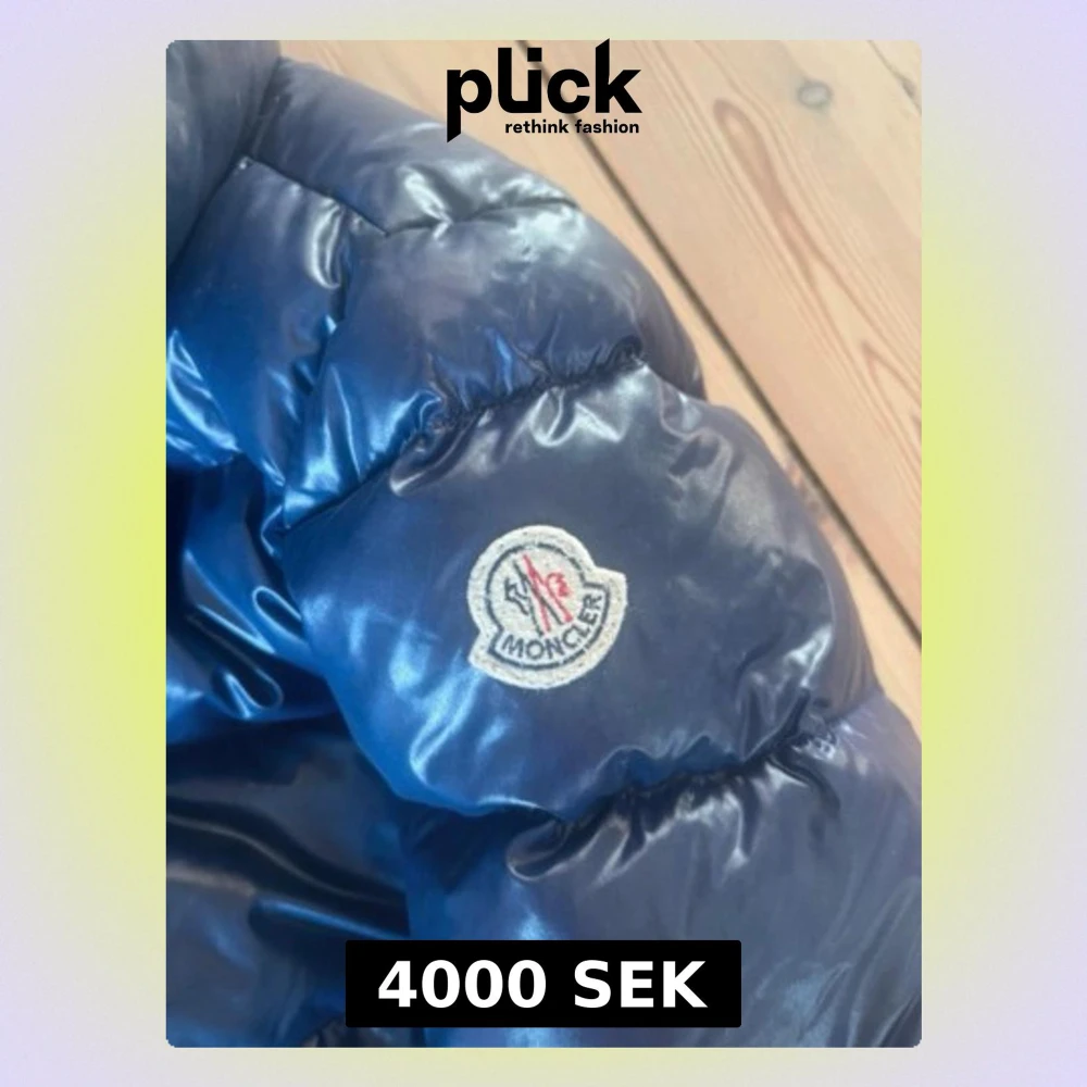 Snygg blå dunjacka från Moncler med glansigt material och klassisk logga på ärmen. Jackan är i storlek 4 vilket passar xs-m äkthetsbevis i jackan.