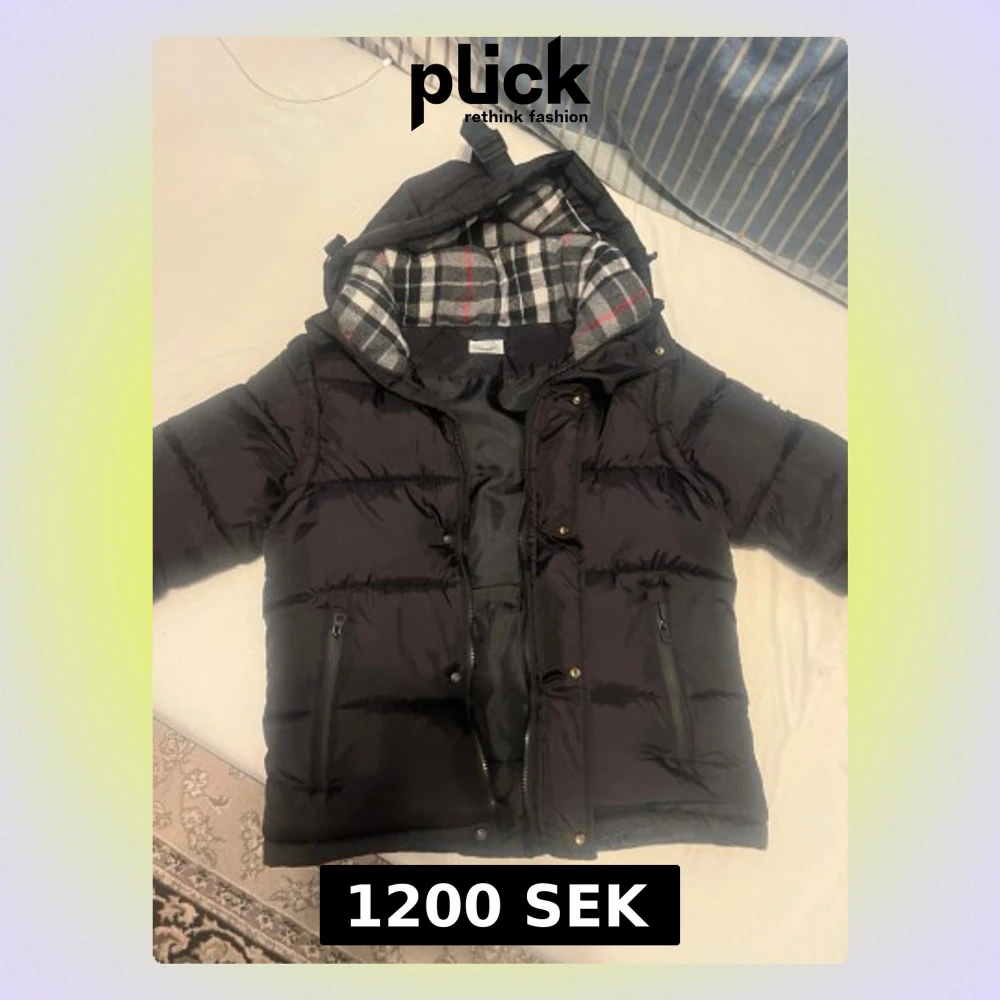 Svart dunjacka från Burberry med avtagbar huva och klassiskt rutigt foder. Jackan har två dragkedjefickor framtill och en tydlig Burberry London England-logga på ärmen. Perfekt för kalla vinterdagar och riktigt snygg streetstil.