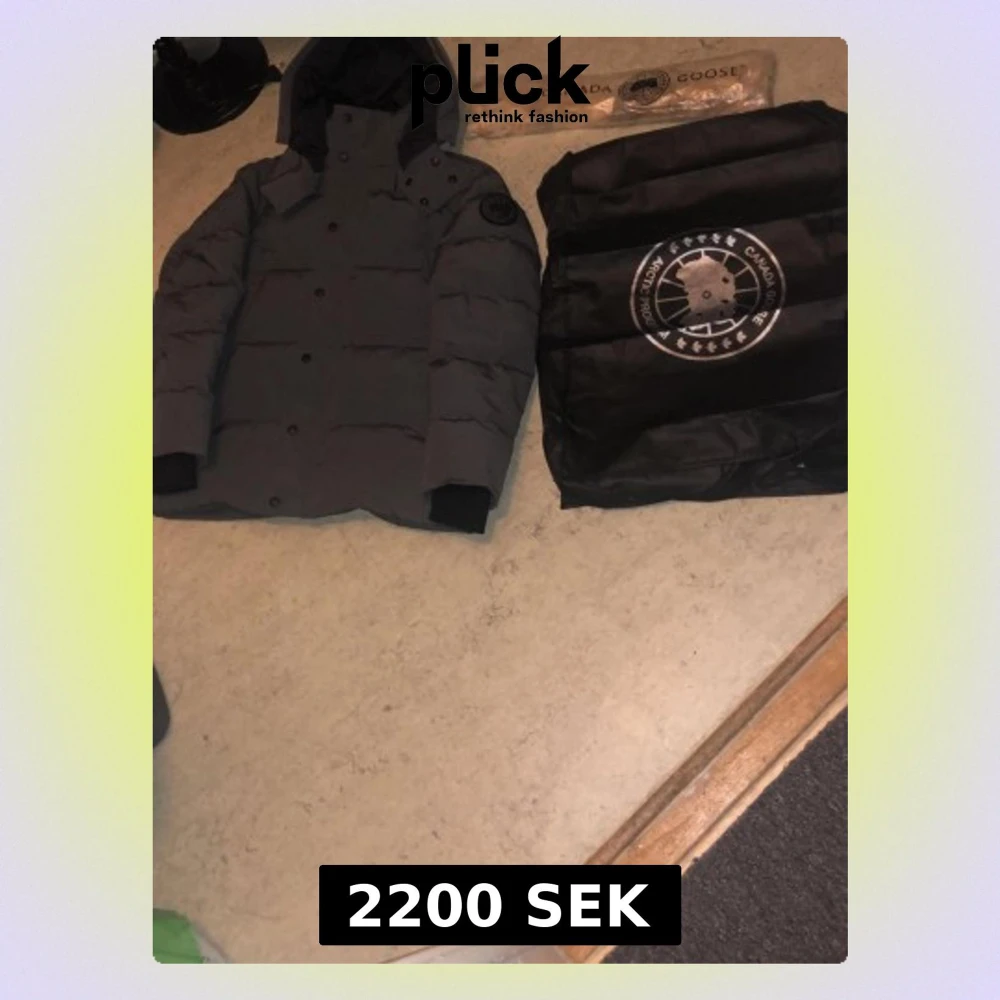 Snygg grå dunjacka från Canada Goose med huva och svart logotyp-patch på ärmen. Jackan har raka linjer, knäppning framtill och ribbade muddar vid ärmsluten. Perfekt för kalla vinterdagar och riktigt varm.