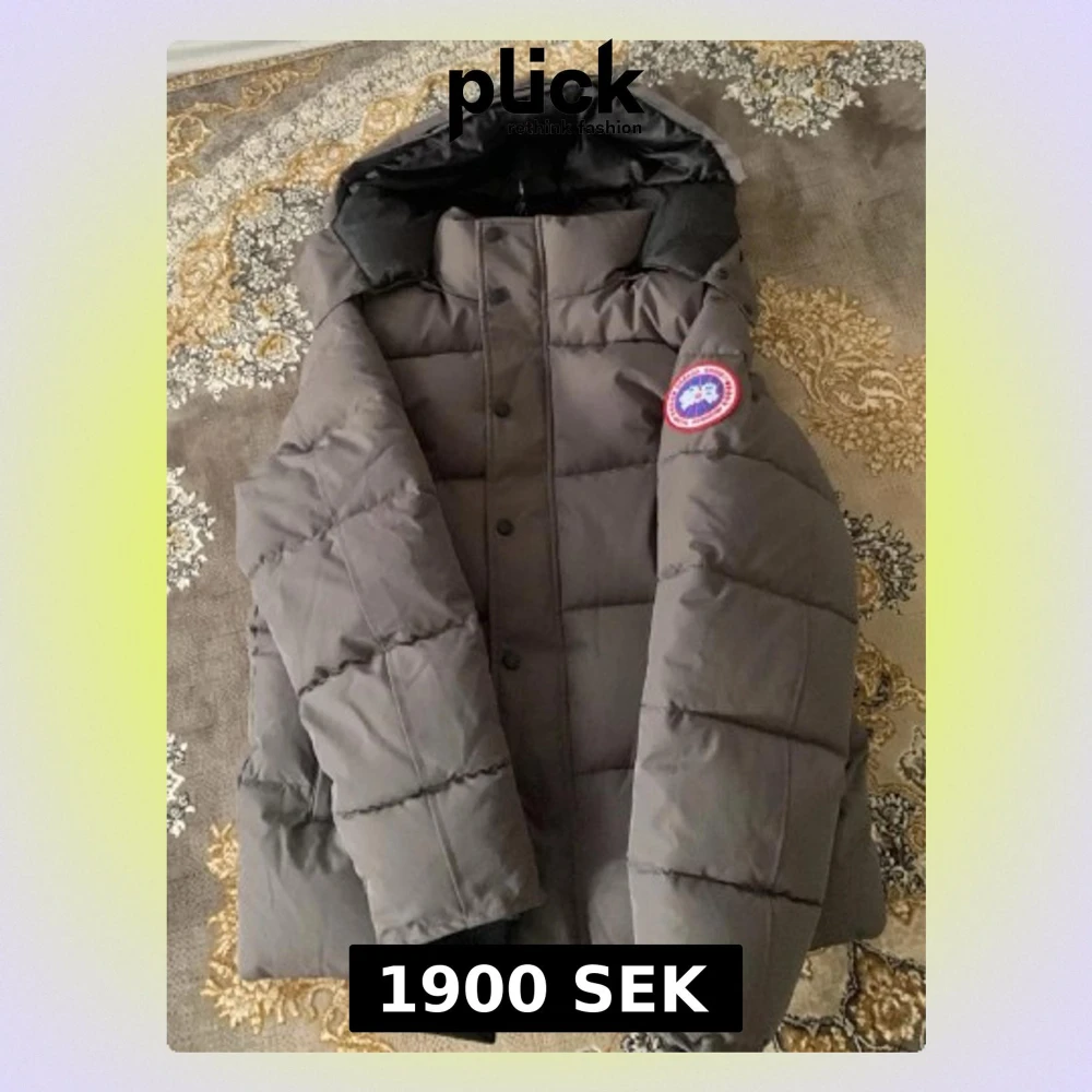 Säljer en mörkgrå dunjacka från Canada Goose med huva och klassisk logotyp på ärmen. Jackan har stora fickor framtill, dragkedja och knappar samt ribbade muddar vid ärmsluten. Perfekt för kalla vinterdagar och riktigt varm.