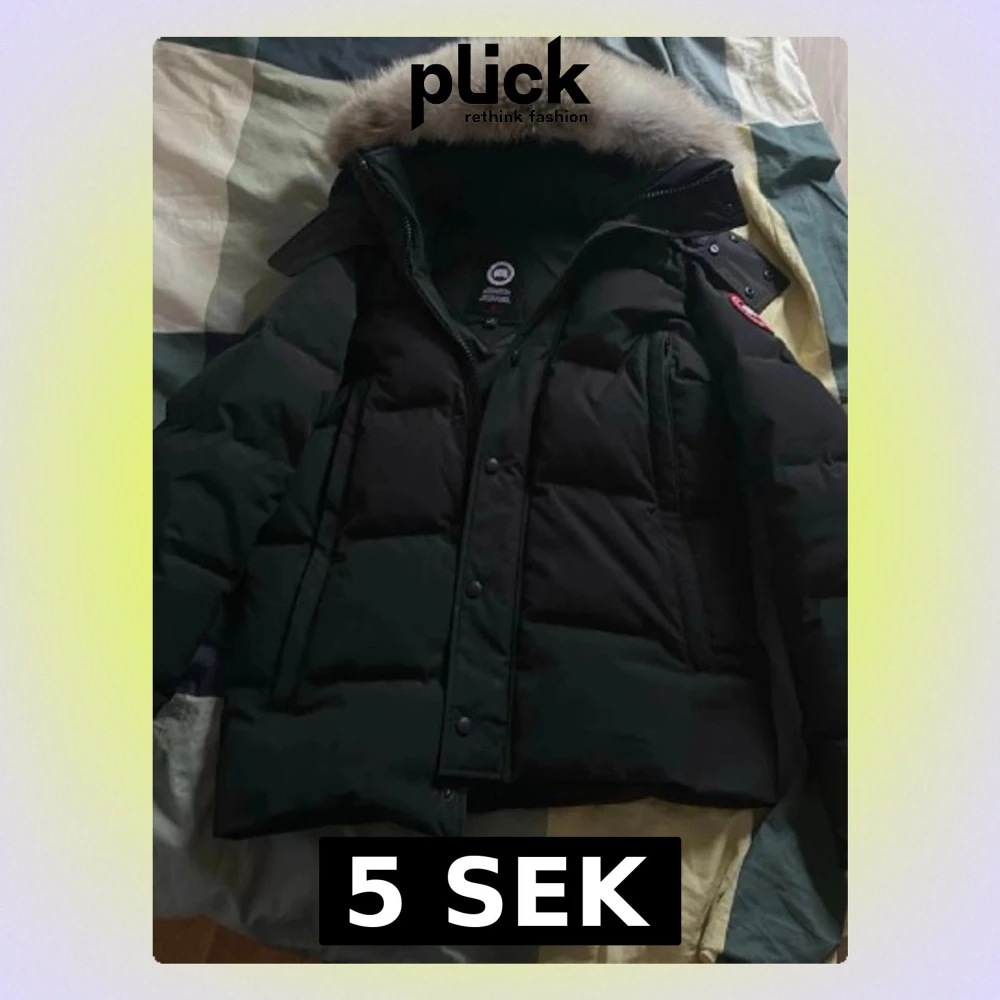 Säljer en svart dunjacka från Canada Goose med stor pälskantad huva och klassisk patch på ärmen. Jackan har en puffig design, dragkedja och knappar framtill samt flera fickor. Perfekt för kalla vinterdagar.