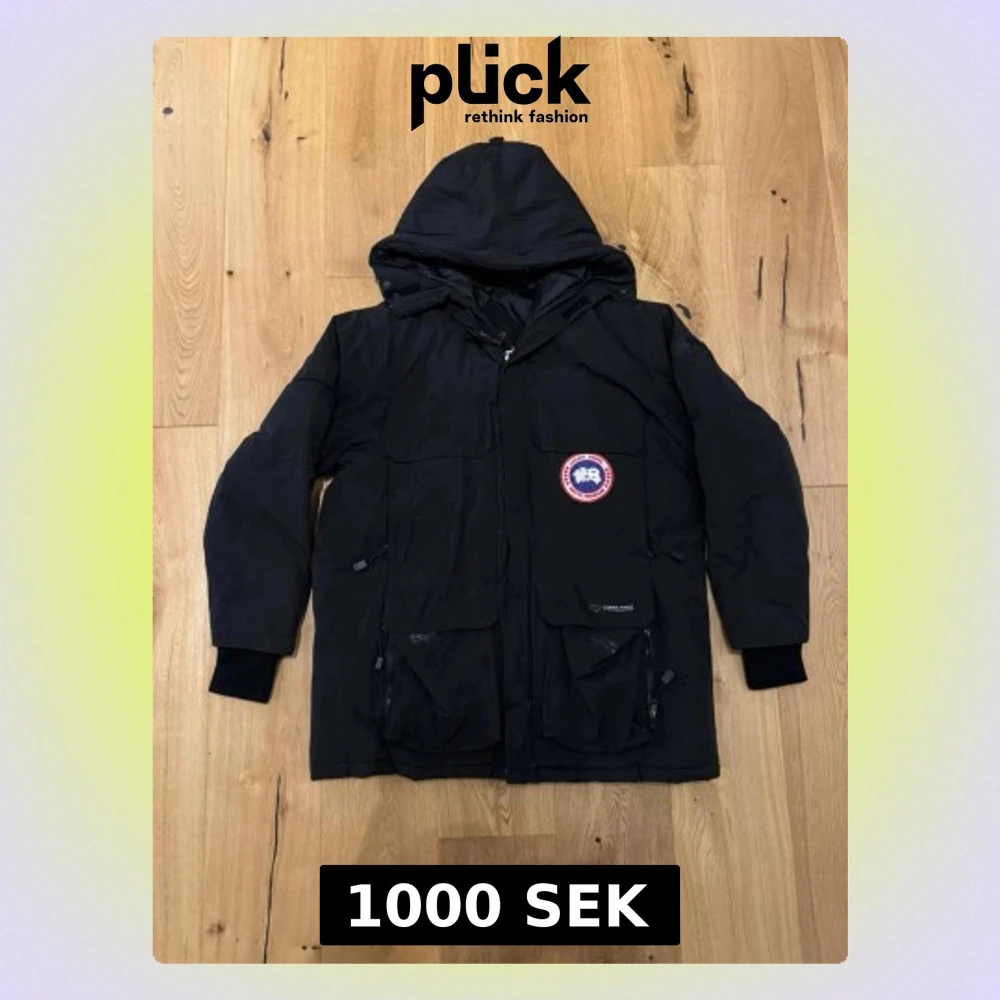 Svart dunjacka från Canada Goose med huva, flera stora fickor och klassisk logotyp på bröstet. Jackan är tillverkad i slitstarkt material och har ribbade muddar vid ärmslut. Perfekt för kalla vinterdagar och riktigt varm.