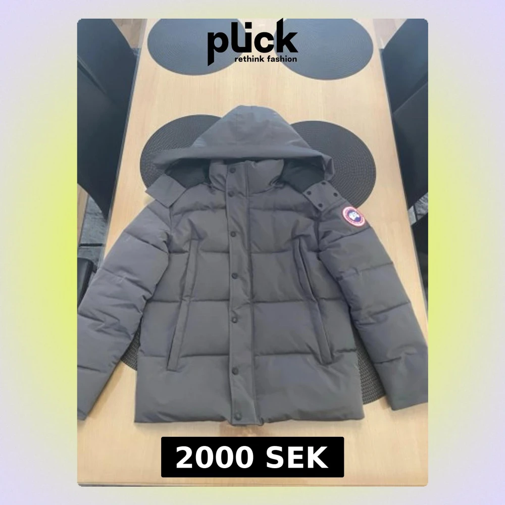 Säljer en grå dunjacka från Canada Goose med huva och klassisk patch på ärmen. Jackan har raka kanaler, två sidofickor och stängs med både dragkedja och knappar. Perfekt för kalla vinterdagar och riktigt snygg streetstil.