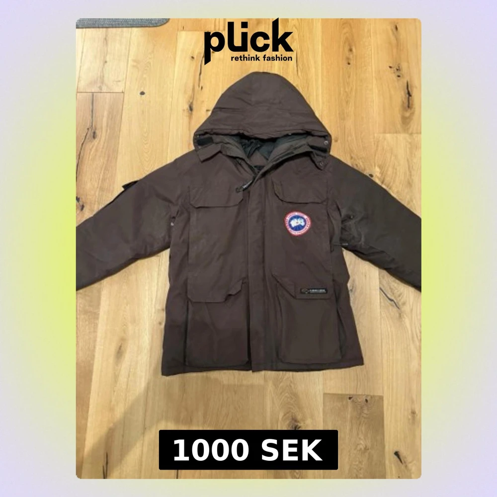 Säljer en brun dunjacka från Canada Goose med huva och klassisk logga på bröstet. Jackan har stora fickor framtill, dragkedja och är perfekt för kalla vinterdagar. Fodrad med dun för extra värme och har en stilren, funktionell design.