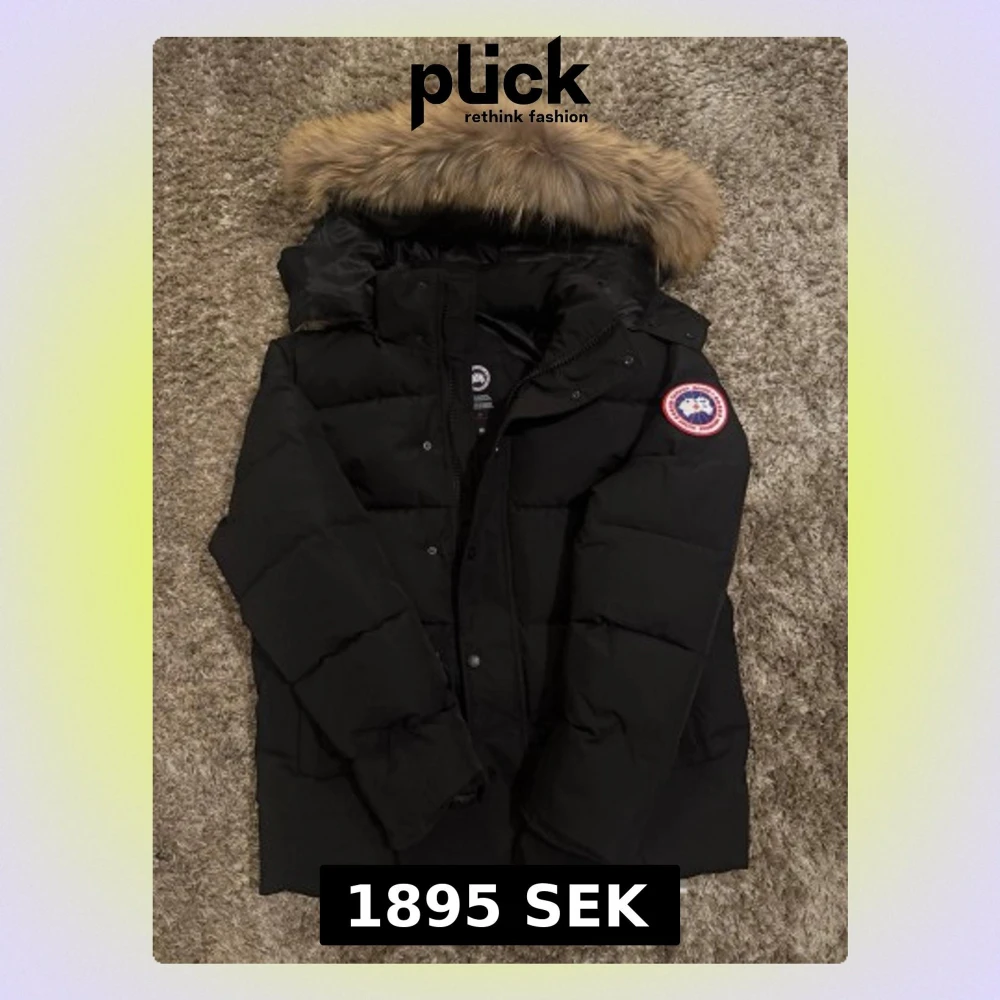 Säljer en svart dunjacka från Canada Goose med stor huva och avtagbar pälskant. Jackan har det klassiska Canada Goose-märket på ärmen och är fylld med dun för extra värme. Perfekt för kalla vinterdagar och har en stilren, tidlös design.