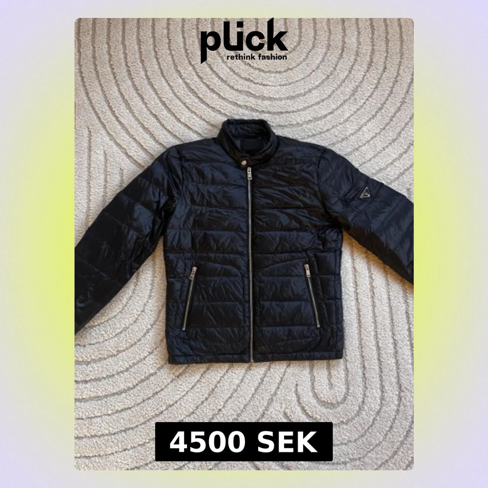 Snygg svart dunjacka från Prada med quiltad design och raka linjer. Jackan har två dragkedjeförsedda fickor framtill och en hög krage. Klassisk Prada-logga på vänster ärm. Perfekt för kalla vinterdagar.