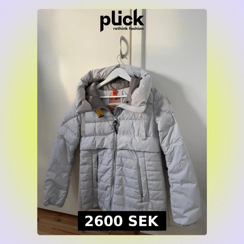 Unik ljusgrå/blå dunjacka från Parajumpers med hög krage, dragkedja och två stora fickor framtill. Jackan har en ikonisk gul detalj vid halsen och ett broderat märke på ärmen. Sista bilderna visar lite defekter av smink men det syns inte när man har den på sig.
