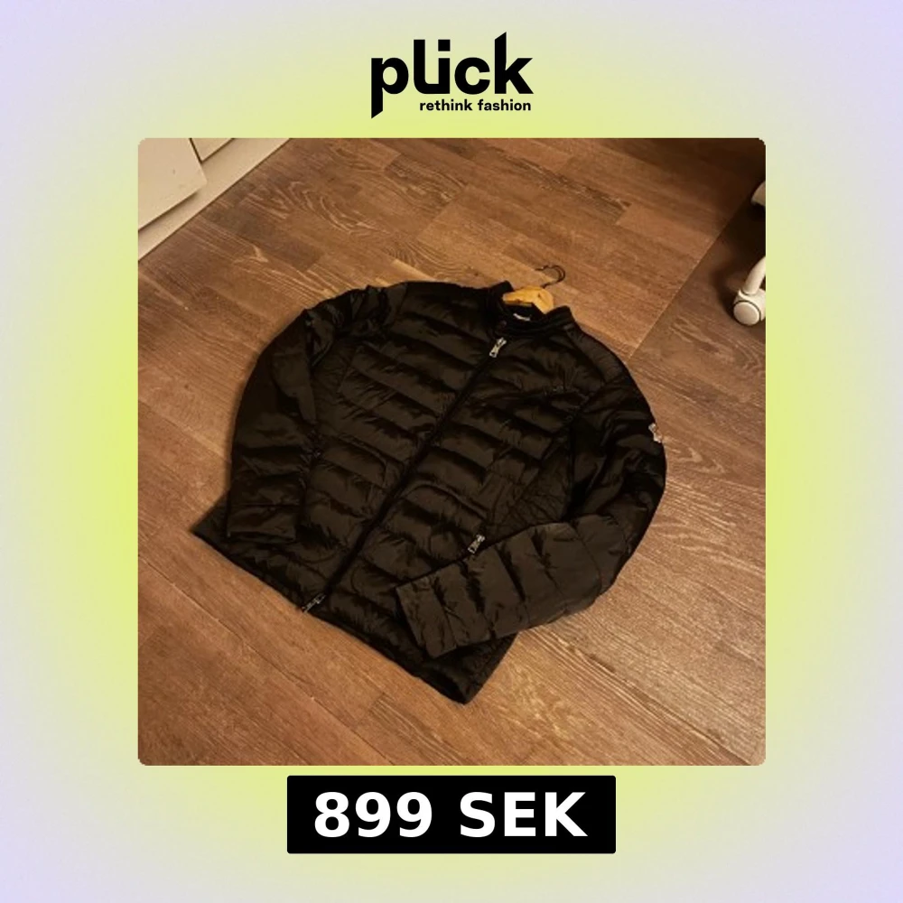 Säljer en svart dunjacka från Moncler med quiltad design och hög krage. Jackan har dragkedja framtill, en bröstficka med dragkedja och diskret Moncler-logga på ärmen. Perfekt för kalla vinterdagar och riktigt snygg till streetwear.