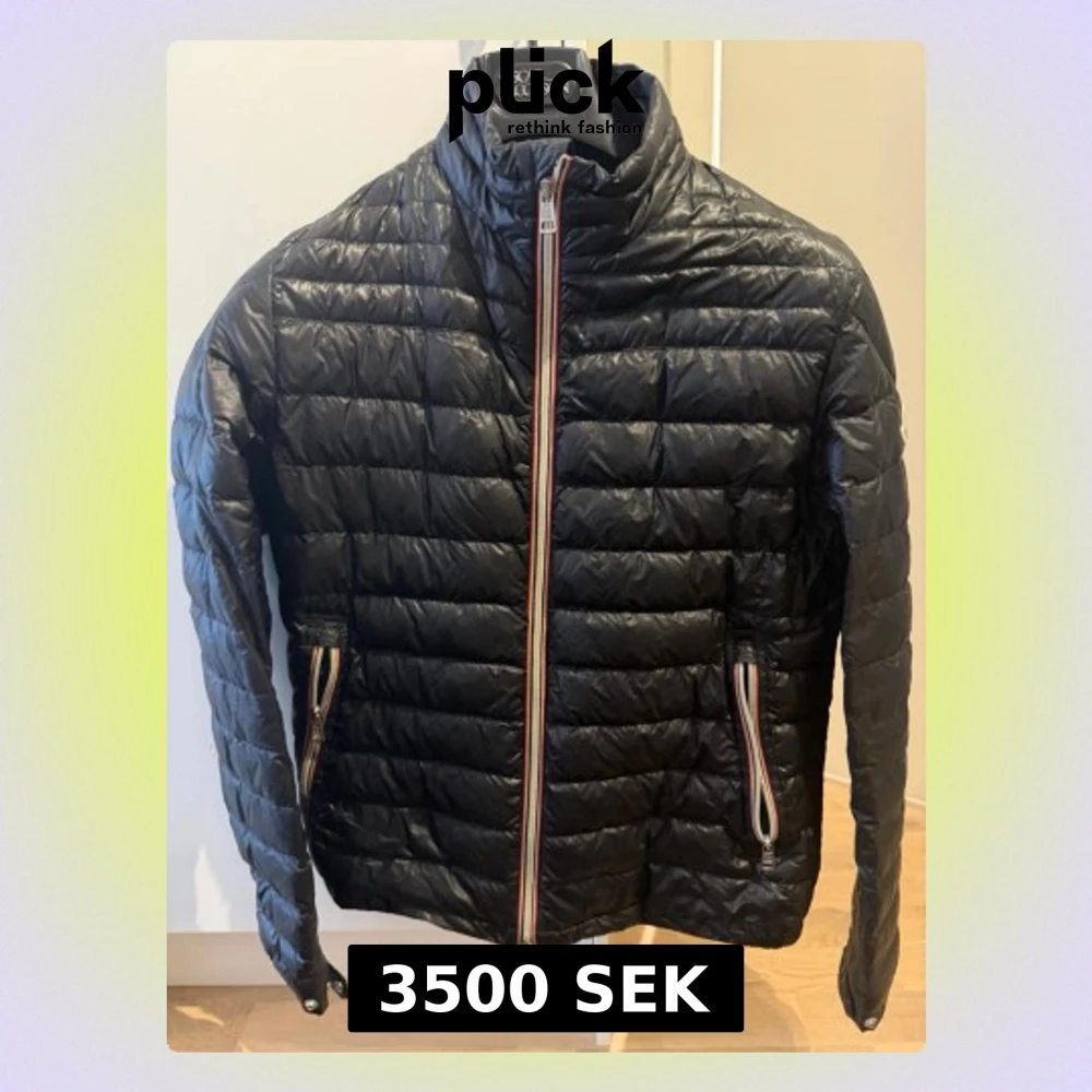 Snygg svart dunjacka från Moncler med quiltat mönster och hög krage. Jackan har dragkedjor med rödvita detaljer och två sidofickor. Moncler-logga på vänster ärm. Perfekt för kalla vinterdagar.