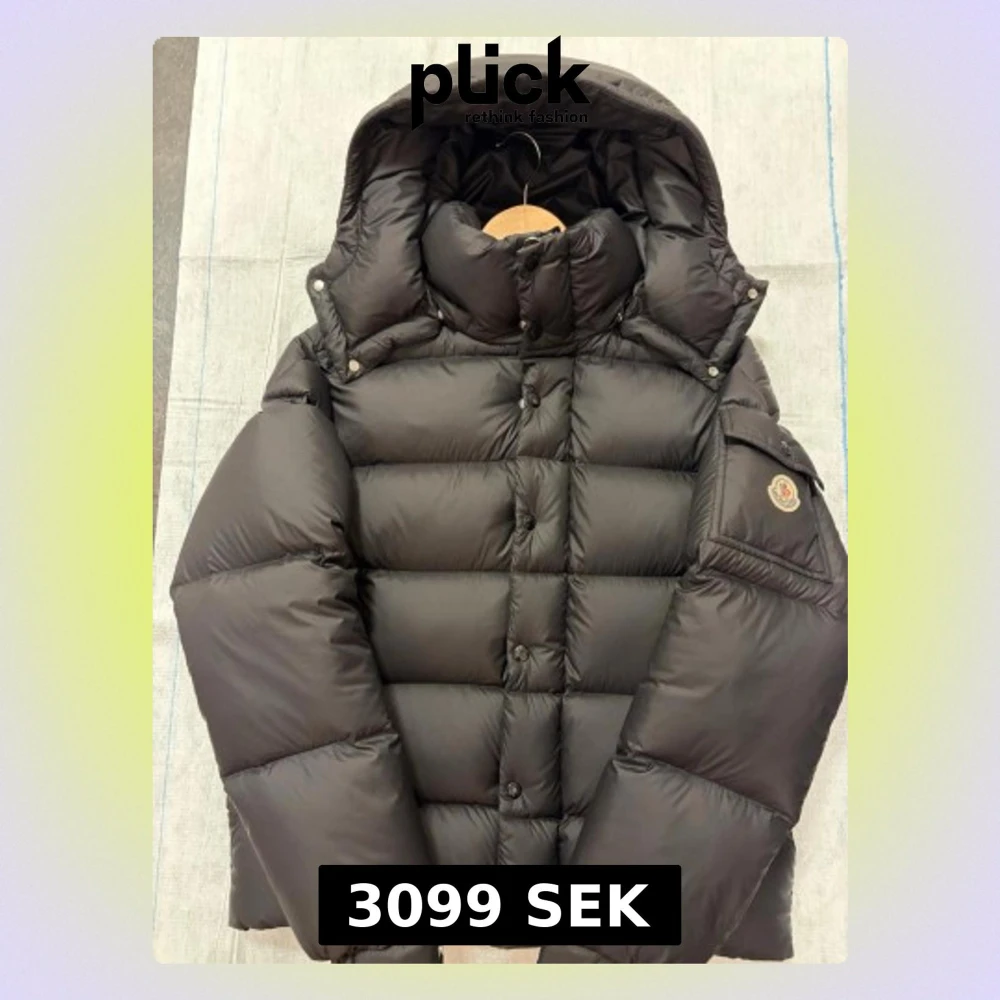 Snygg svart dunjacka från Moncler med stor huva och klassisk logga på ärmen. Jackan har quiltad design, hög krage och tryckknappar framtill. Perfekt för kalla vinterdagar och riktigt varm tack vare dunfyllningen.