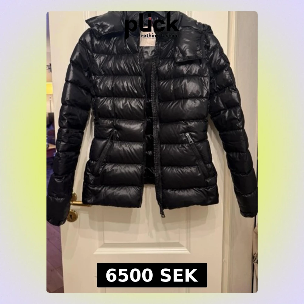 Svart dunjacka från Moncler - Snygg svart dunjacka från Moncler med glansig finish, huva och dragkedja framtill. Jackan har Moncler-logga på ärmen och två sidofickor med dragkedja. Perfekt för kalla vinterdagar och riktigt trendig look. Storlek S Om du är 170-172cm så passar den dig 👌NFC Funkar