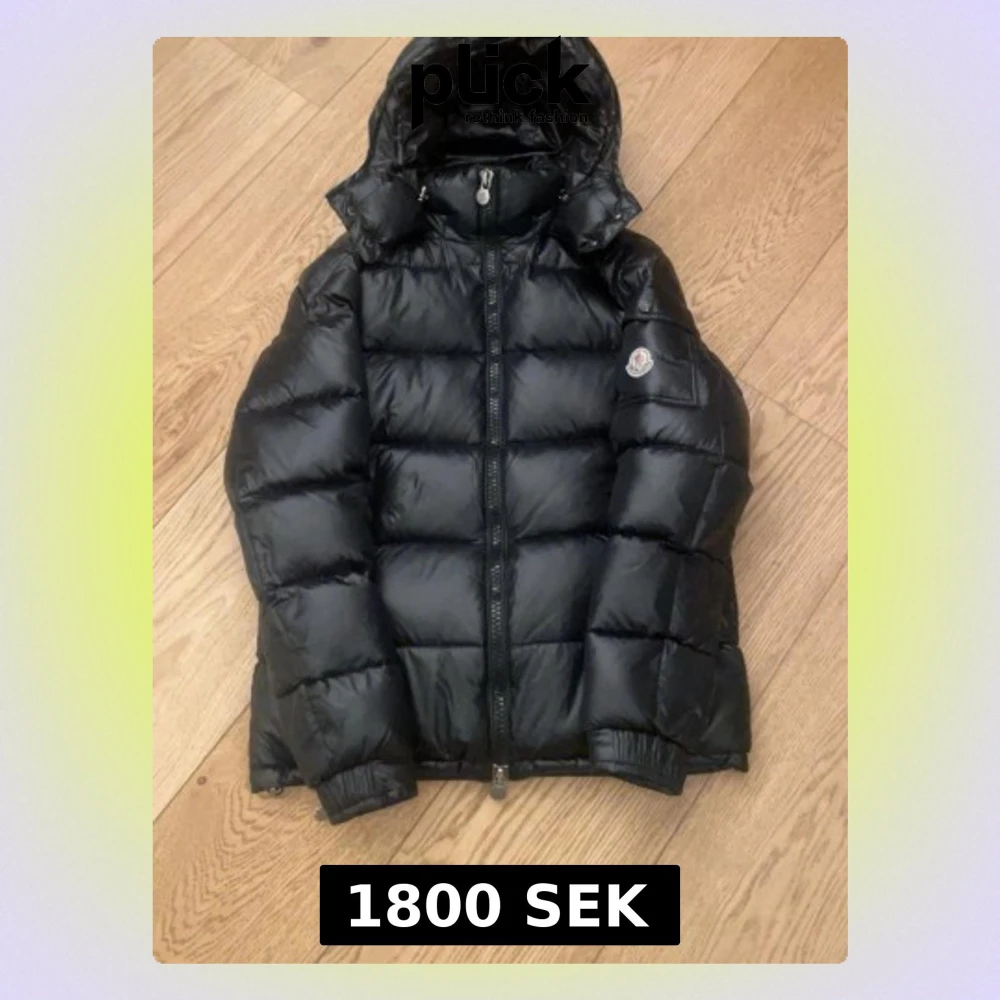 Snygg svart dunjacka från Moncler med huva och klassisk logga på ärmen. Jackan har quiltad design, dragkedja framtill och elastiska muddar vid ärmslut. Perfekt för kalla vinterdagar och riktigt stilren look.
