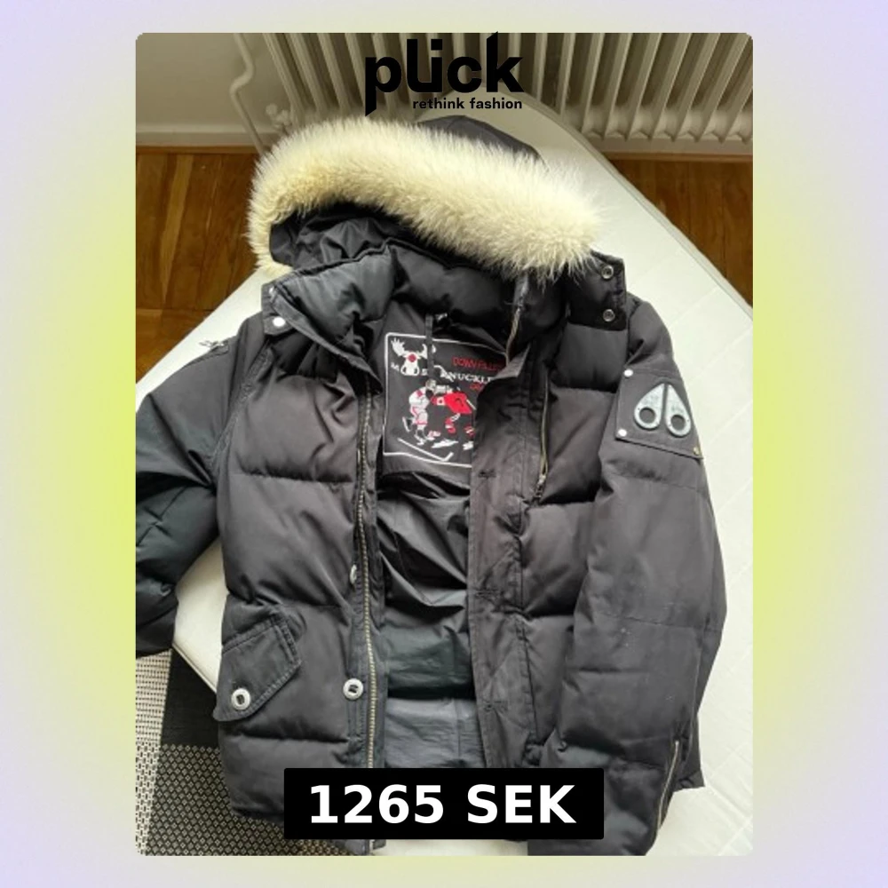 Säljer en svart dunjacka från Moose Knuckles med avtagbar huva och snygg pälskant. Jackan har broderad logga på insidan, två framfickor med knappar och dragkedja. Perfekt för kalla vinterdagar och riktigt varm.