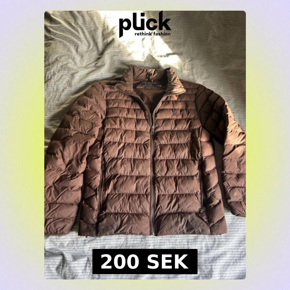 Schysst dunjacka från Ralph Lauren, använd en del som man ser på bilderna. Bild 3, litet hål framsidan nertill. Bild 2 så har tagen lossnat. Utöver det så är den hyfsat okej, lite smutsig.